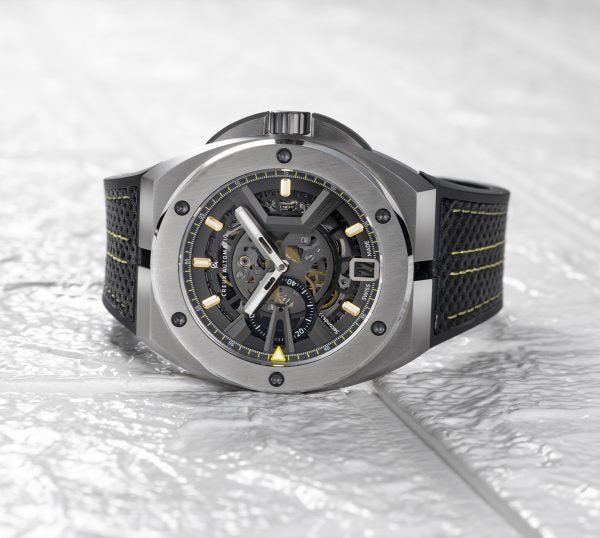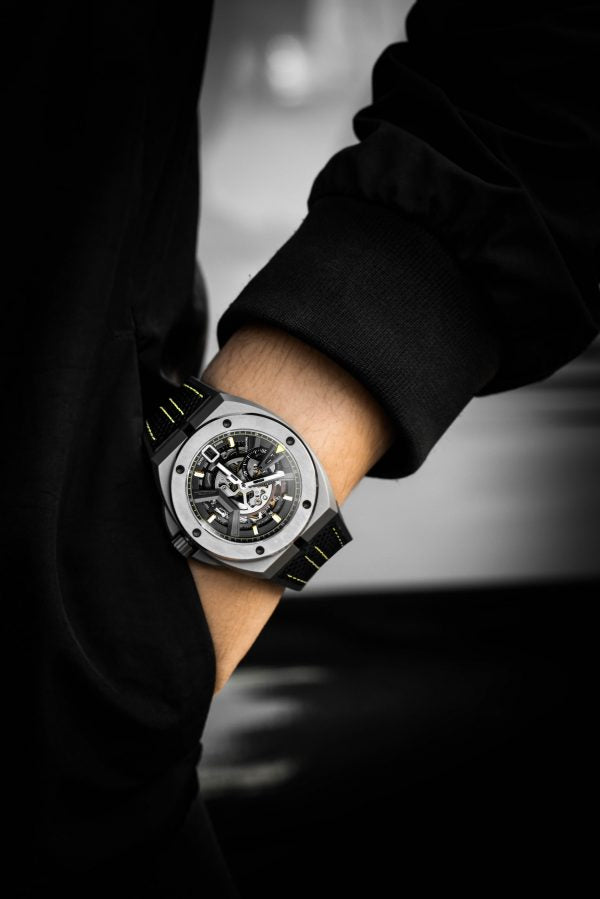 Strap: Black FKM Rubber & Perforated Leather Racing Strap w/ Yellow stitching