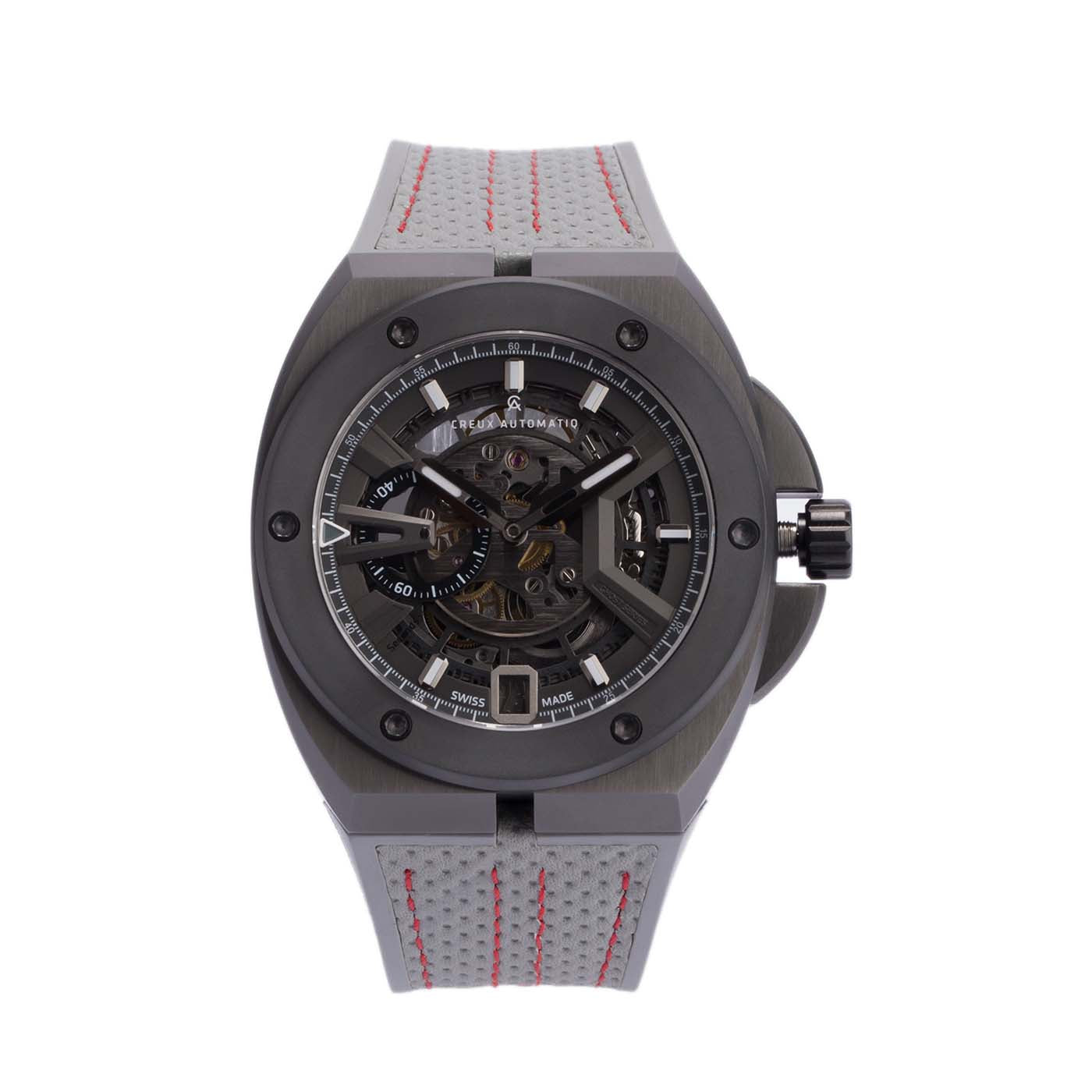 Limited to 20 pieces worldwide. Each watch comes in a box with papers, strap changing tool and a 2 year warranty. Case Size: 45mm Dimensions: 45mm x 50mm x 12.9mm Case material: Titanium w/ microbrille sandblast & gunmetal PVD finish Bezel material: Black ceramic w/ matte finish Deployment Clasp: 316L Stainless steel w/ gun metal PVD Strap: Grey perforated leather racing strap w/ red stitching Top Lens: Sapphire Crystal Water Resistance: 10 ATM (100 Meters) Lume: Super Luminova Movement: Swisstech CA24-SK8 Made in: Switzerland