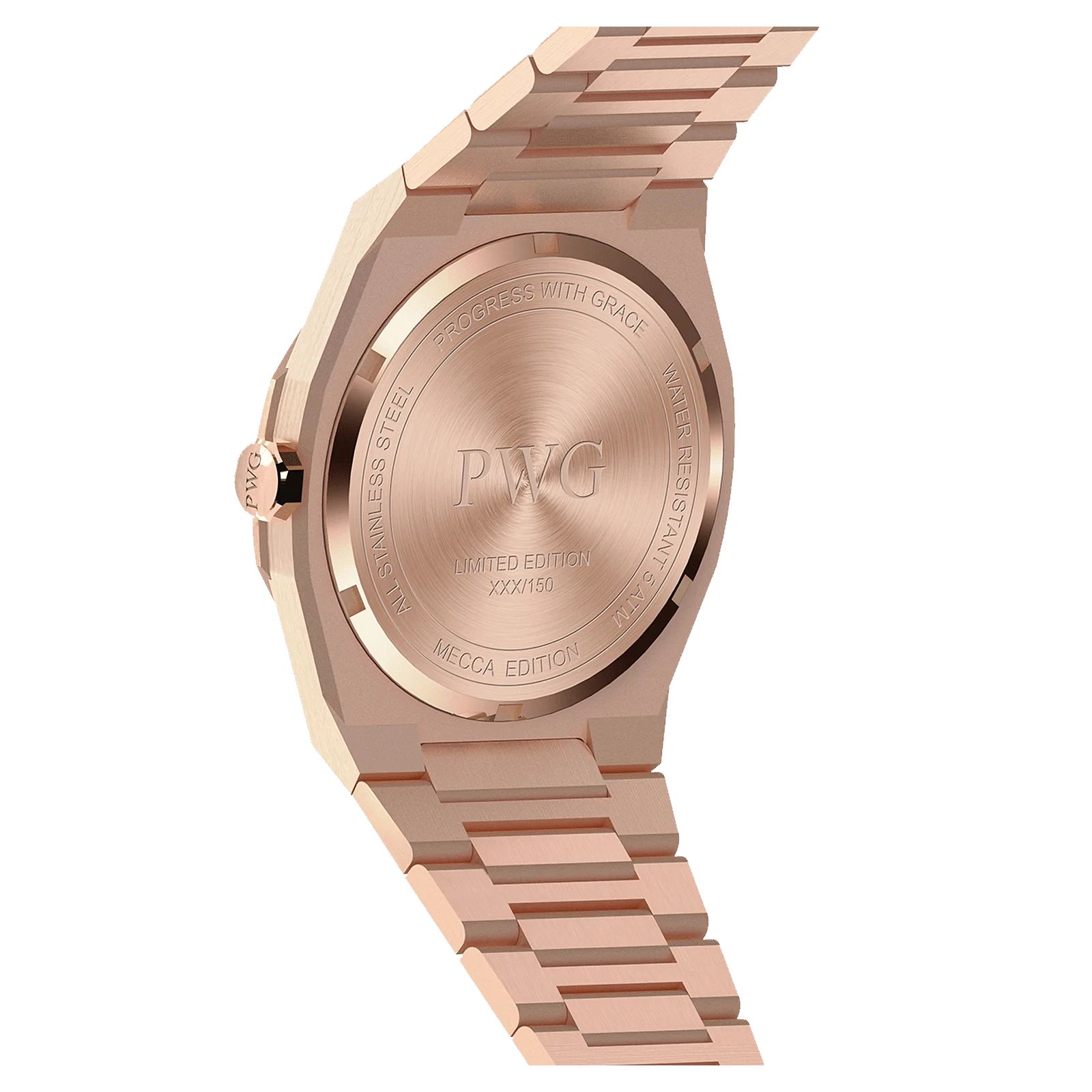 Exclusively limited to 200 pieces, the PWG Mecca Rose Gold 42MM is a masterpiece of elegance and precision. Crafted with a 42MM stainless steel case, this timepiece embodies luxury and durability.