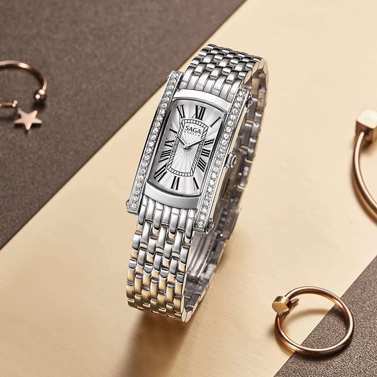 SAGA Women's Vintage Fashion Watch Rectangle 316L Stainless Steel Quartz Ladies Crystal