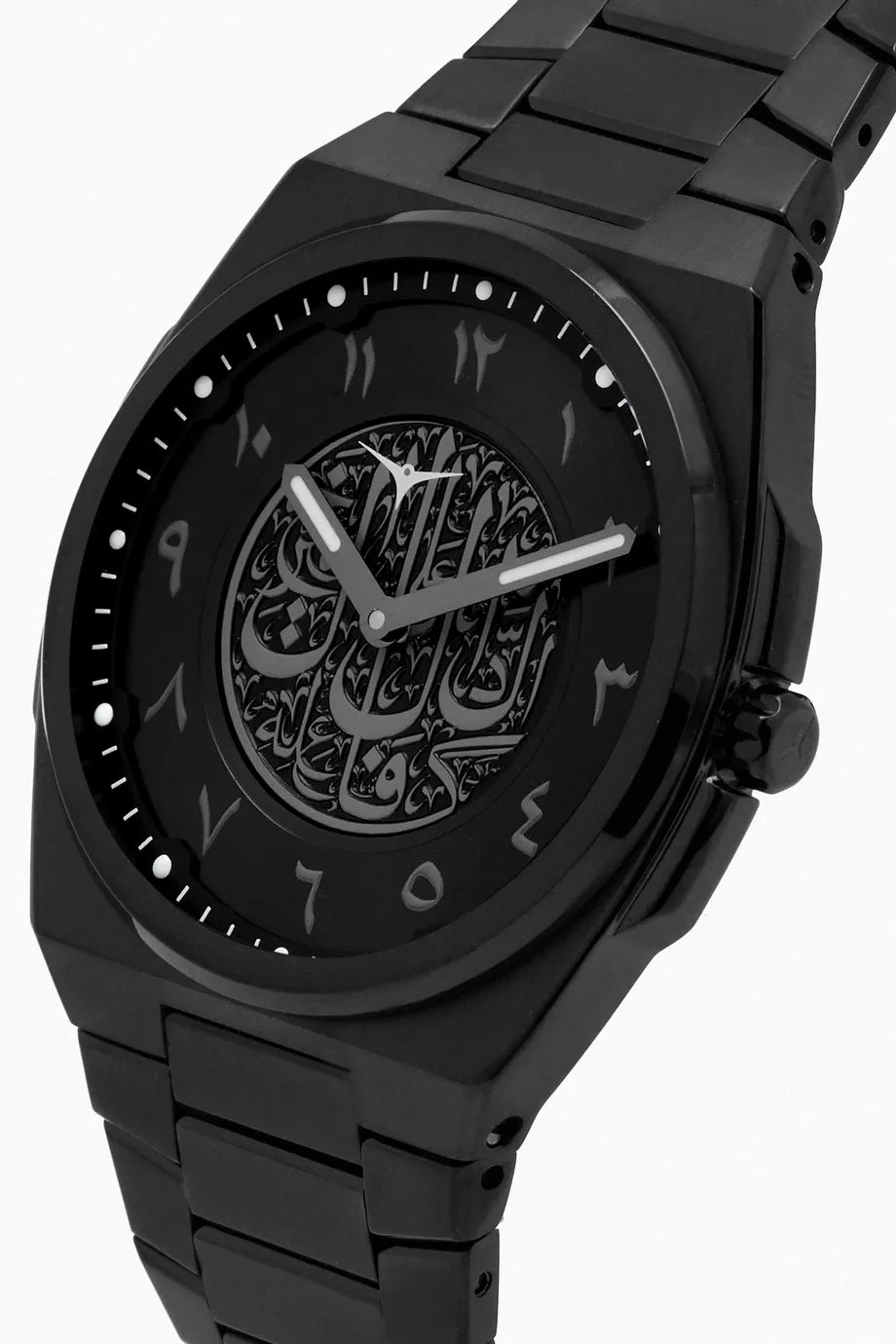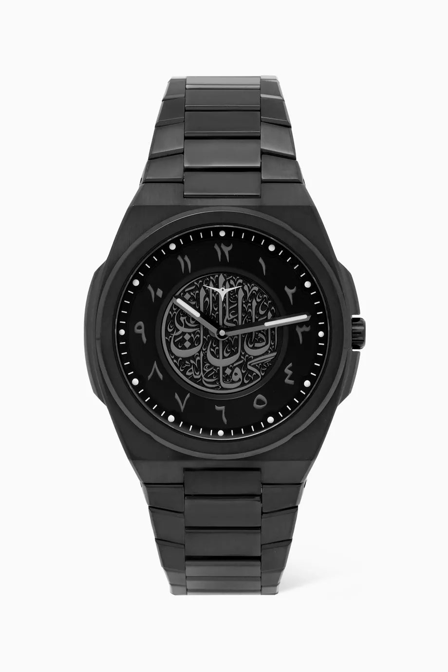 • Set beneath scratch-resistant sapphire crystal, the dial is inlaid with Arabic numeral markers and calligraphy in the middle
